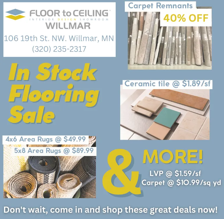 FLOOR to CEILING INTERIOR DESIGN SHOWROOM WILLMAR 106 19th St. NW. Willmar, MN (320) 235-2317 In Stock Flooring Sale 4x6 Area Rugs @ $49.99 SER R 5x8 Area Rugs @ $89.99 Carpet Remnants 40% OFF www Ceramic tile @ $1.89/sf MORE! LVP @ $1.59/sf Carpet @ $10.99/sq yd & Don't wait, come in and shop these great deals now! FLOOR to CEILING INTERIOR DESIGN SHOWROOM WILLMAR 106 19th St. NW . Willmar , MN ( 320 ) 235-2317 In Stock Flooring Sale 4x6 Area Rugs @ $ 49.99 SER R 5x8 Area Rugs @ $ 89.99 Carpet Remnants 40 % OFF www Ceramic tile @ $ 1.89 / sf MORE ! LVP @ $ 1.59 / sf Carpet @ $ 10.99 / sq yd & Don't wait , come in and shop these great deals now !